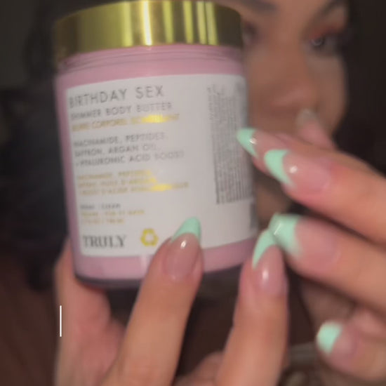 Dale a tu piel un impulso de hidratación, brillo y firmeza con la Manteca Corporal Shimmer Birthday Sex de TRULY: una fórmula rica, lujosa y sedosa que transforma la piel seca o sin vida al instante.
