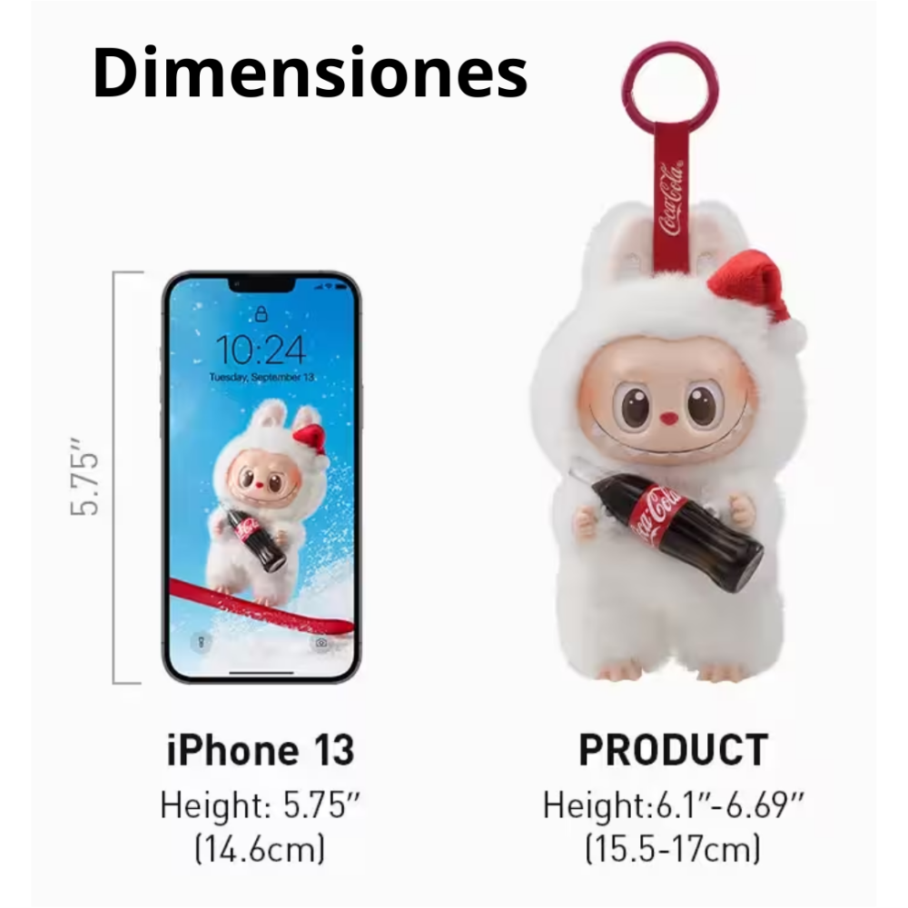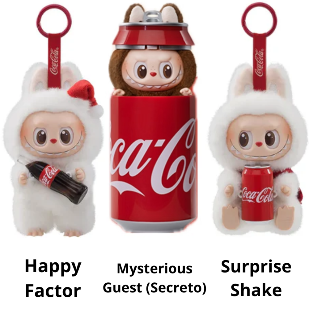 - Diseño exclusivo: Labubu con atuendos festivos junto a iconografía Coca‑Cola (botella, lata, colores rojo y blanco) .